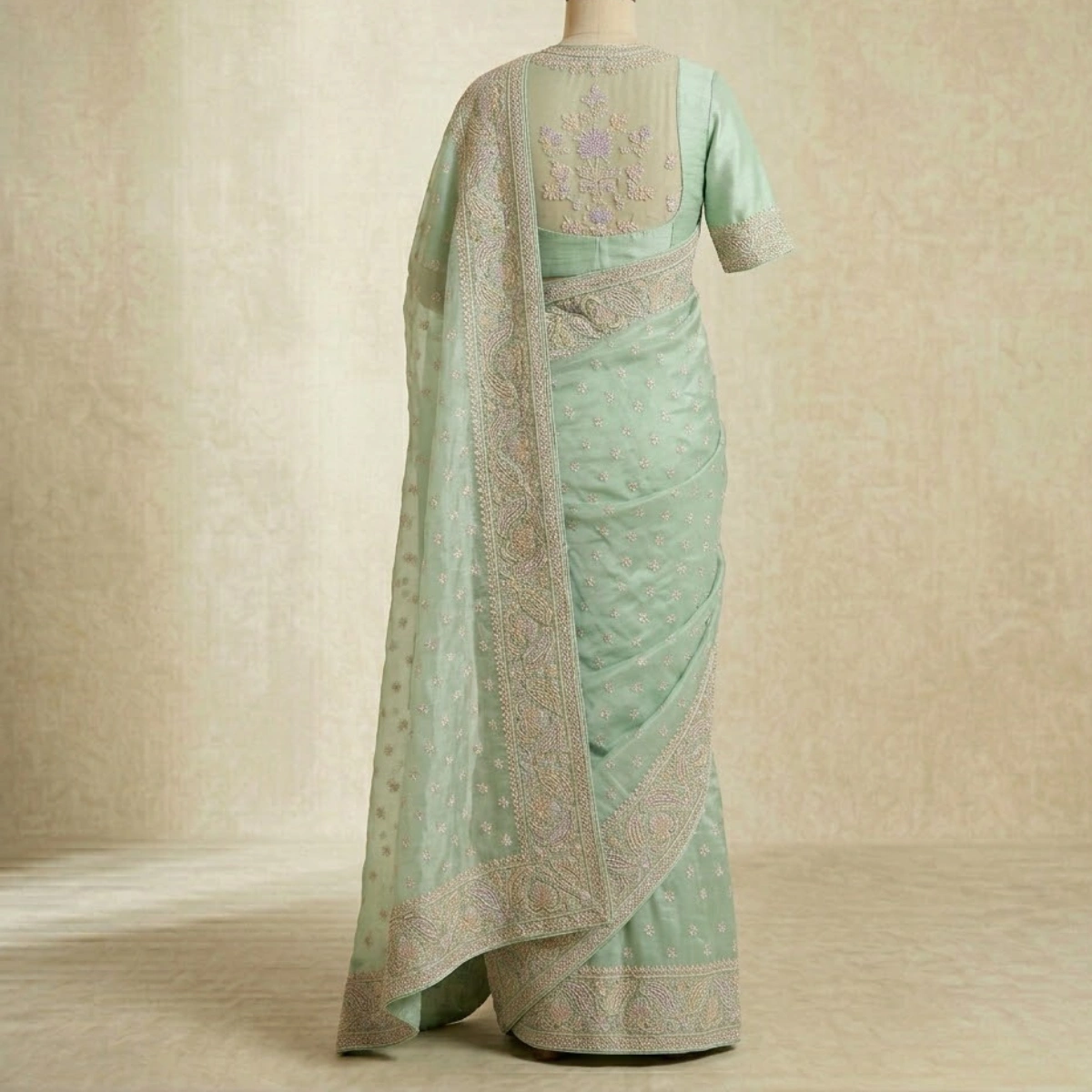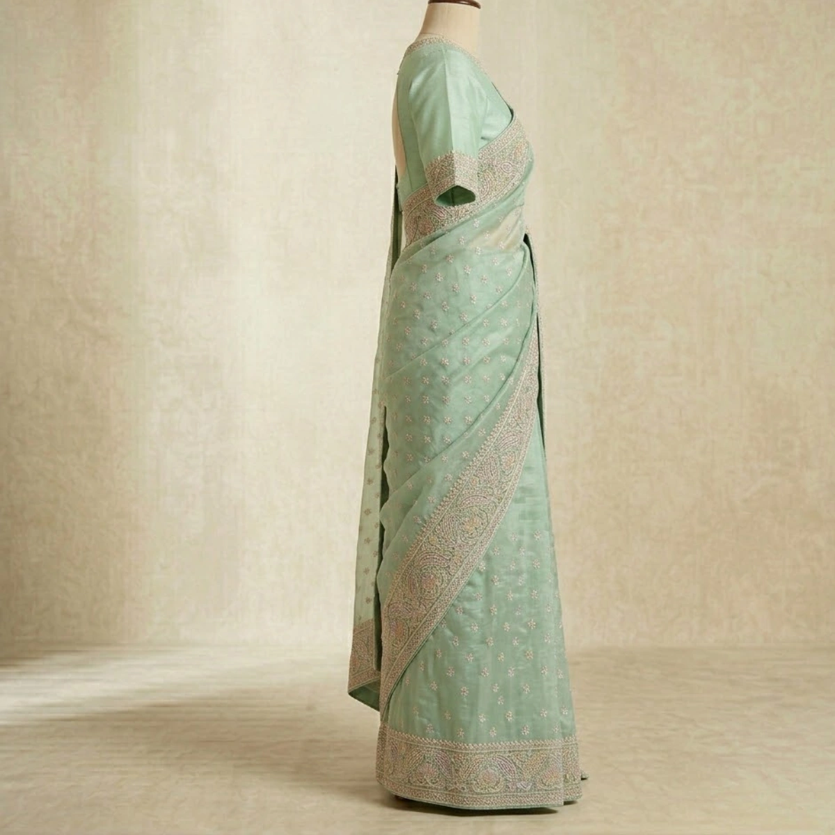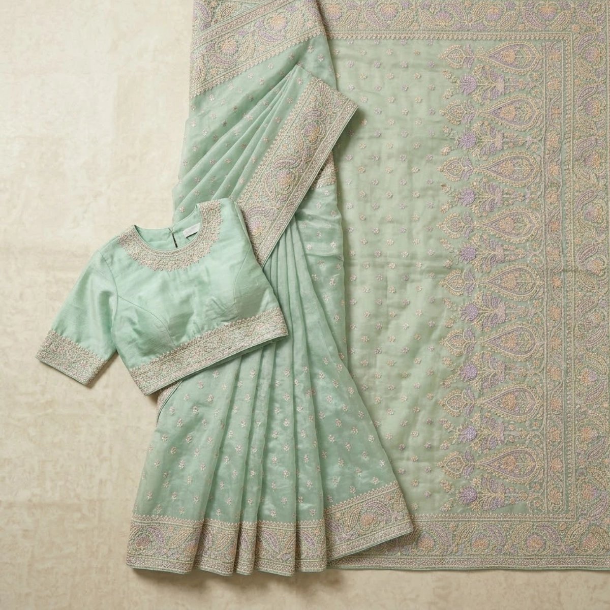 A modern saree designed for comfort and elegance, featuring subtle embroidery and stylish patterns.